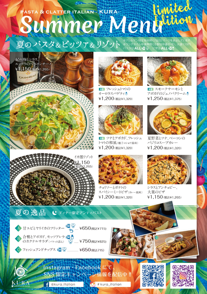 投稿日: 2024年7月8日2024年7月17日 投稿者: wpmaster2024年 夏メニューが始まりました! 「2024年の夏季限定メニュー」がスタートしました! 今が旬の食材を使用した、おすすめのメニュー「紀州梅とシラス、ルッコラのペペロンチーノ」もお楽しみいただけます! この夏にぴったりの味わいをお楽しみいただけるので、ぜひKURAにお越しください。 その他にも、夏の旬の食材を使用した多彩なメニューをご用意してお待ちしております。 ※店舗によって価格が異なる場合がございます。