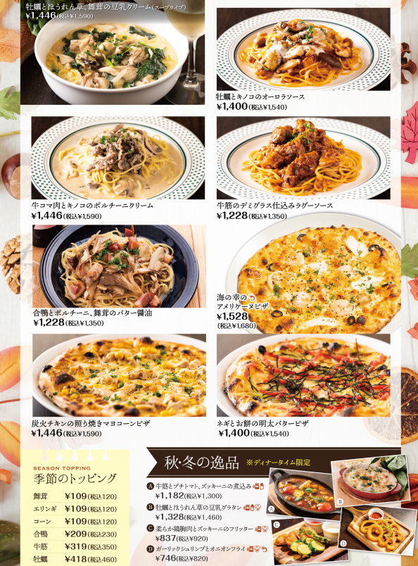 投稿日: 2025年10月15日2025年10月15日 投稿者: wpmaster2025年 秋・冬メニューが始まりました! 「2025年の秋・冬限定メニュー」がスタートしました! おすすめメニューの「牡蠣とほうれん草、舞茸の豆乳クリーム」もお楽しみいただけます! この季節にぴったりの味わいをお楽しみいただける限定メニューですので、ぜひKURAにお越しください。 その他にも、多彩なメニューをご用意してお待ちしております。 ※店舗によって開始時期と価格が異なる場合がございます。